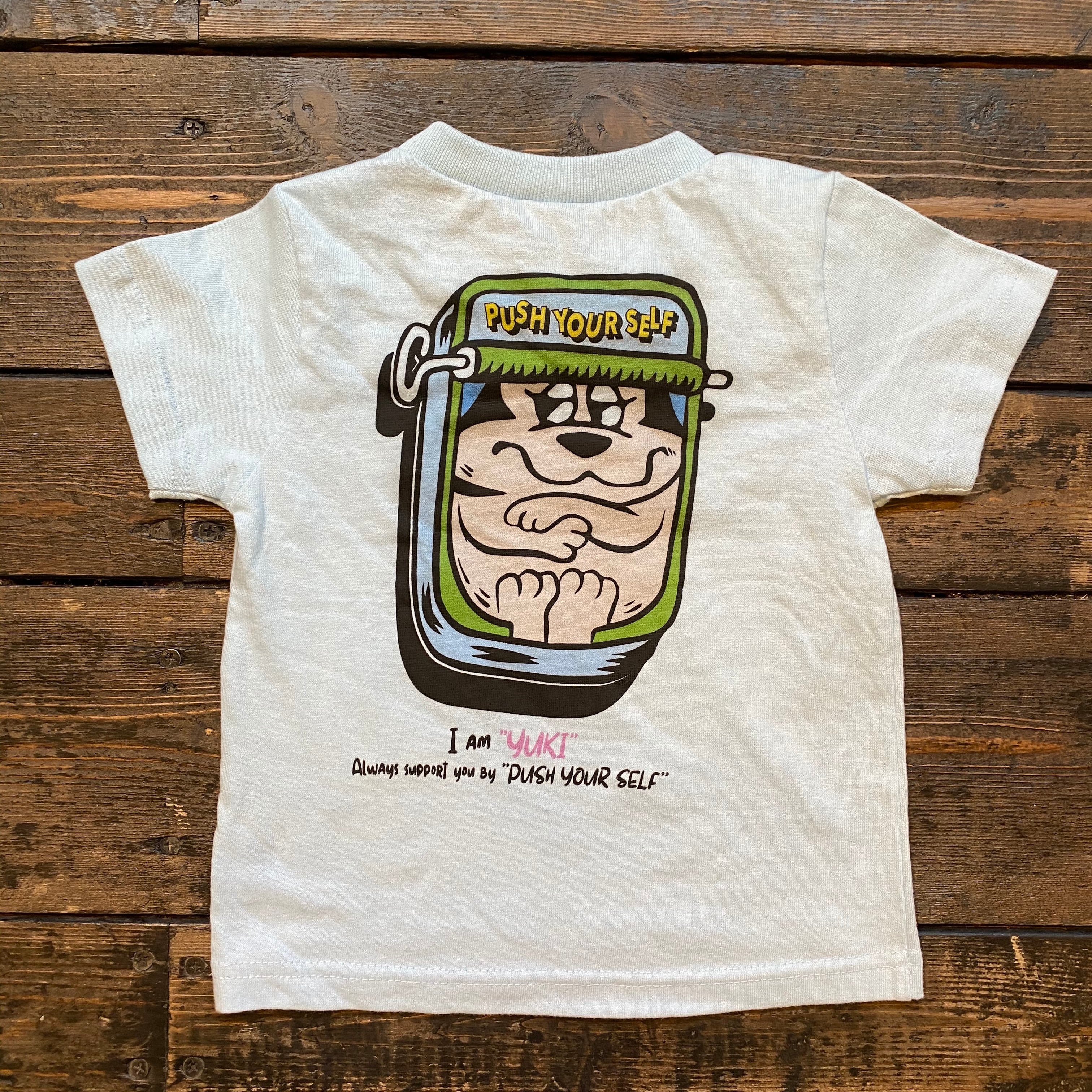 ①ライトブルー ''クマさん缶詰に入っちゃって出れなくなったよTシャツ!''